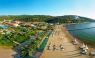 Собствен, пясъчен с дължина 300 м, притежаващ сертификат "Син флаг" и кей със 150 м дължина. Чадъри, шезлонги, матраци и плажни кърпи на плажа и при басейна - безплатно.