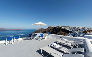 Хотелът предлага кафе-бар с тераса и гледка към калдерата на Санторини.